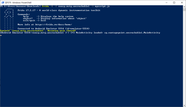 frida -U -f owasp.mstg.uncrackable1 -l myscript.js