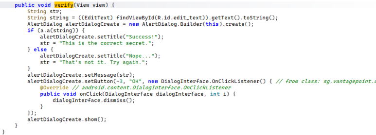 var aClass = Java.use("sg.vantagepoint.uncrackable1.a");