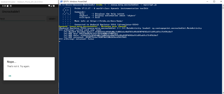 - 클래스 경로 불일치: Jadx로 확인한 패키지명(sg.vantagepoint.uncrackable1)과 Frida 후킹 시점에 맞추지 않으면 ClassNotFoundException 발생